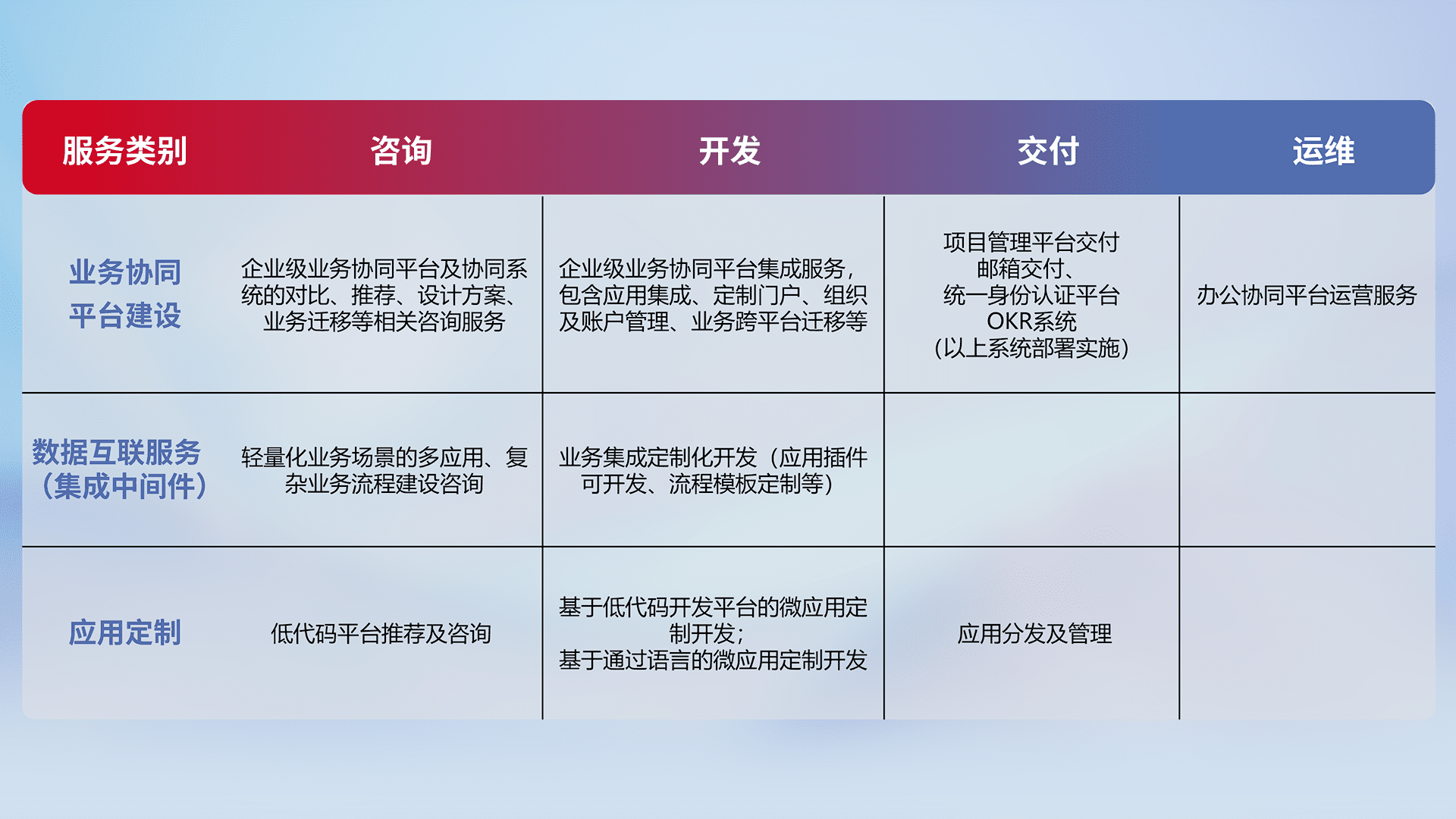 针对钉钉、、企微、、、IDaas等平台级产品提供产品的规划、、、方案、、交付、、、、定制化开发等服务,,实现如统一协同办公、、、、智能客户服务、、混合会议管理、、智能数据查询、、等业务场景,,,,实现数字化转型。。。
